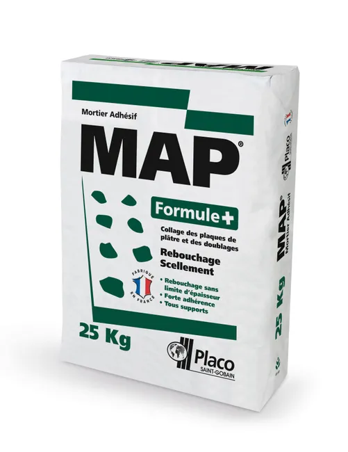 MAP Formule+ est le mortier de référence pour coller des plaques de plâtre et des doublages (plaques de plâtre et isolants) mais aussi pour effectuer des scellements et rebouchages.